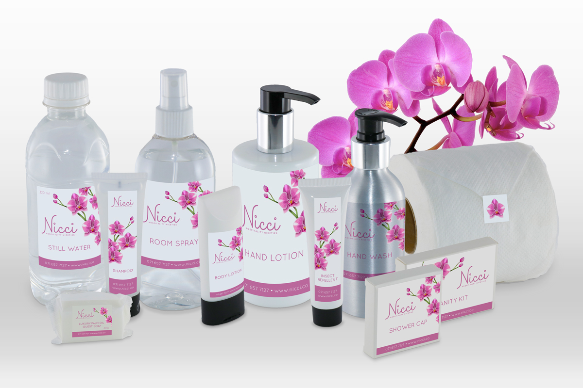 Your one-stop shop in Hospitality Niceties for shampoo’s, shower gels, lotions, air freshener, insect repellent, soaps, shower caps, shoe mitts, vanity packs, mending kits, shaving & dental kits, bulk refill, slippers, bath salts, personalisation & development, as well as product labelling, and much more…